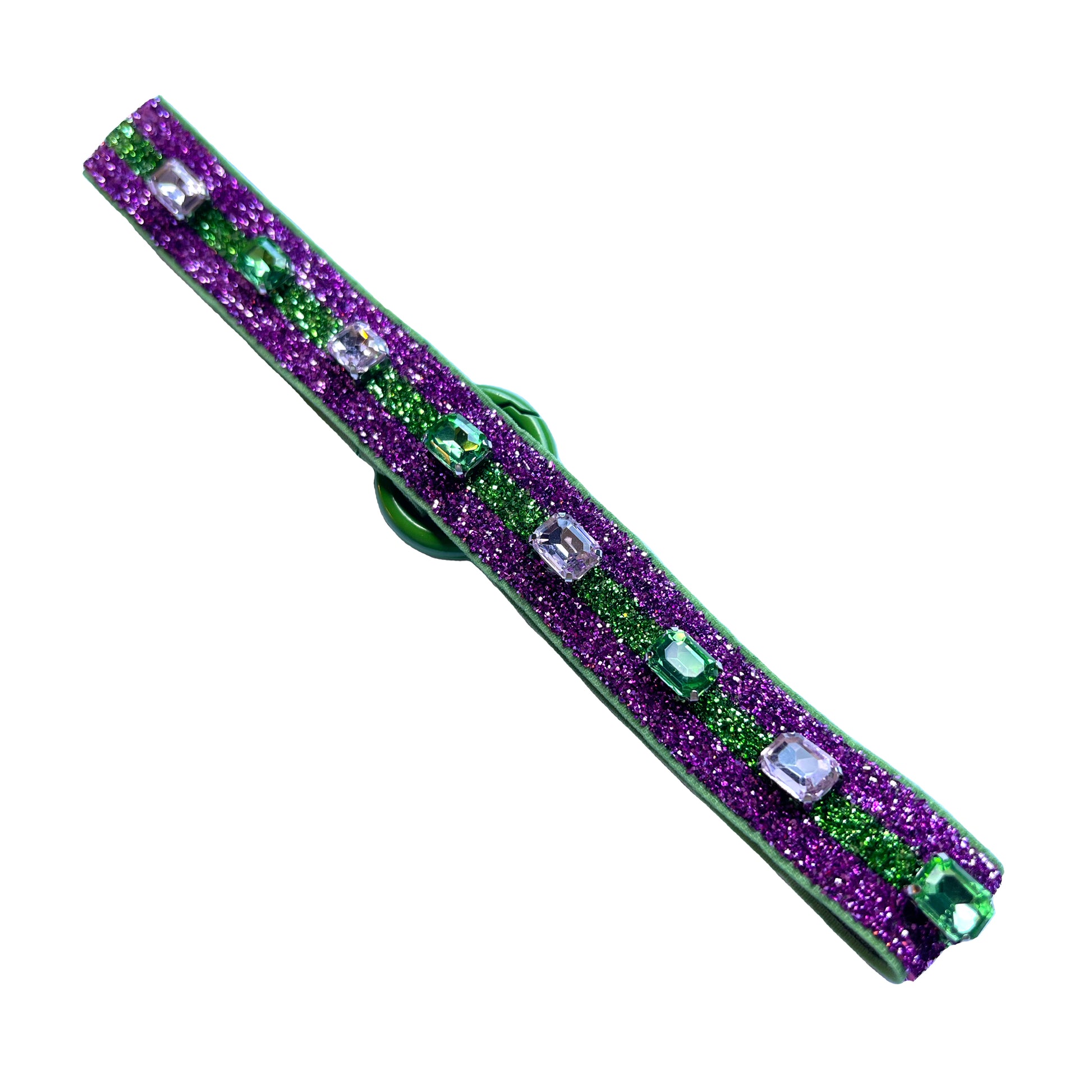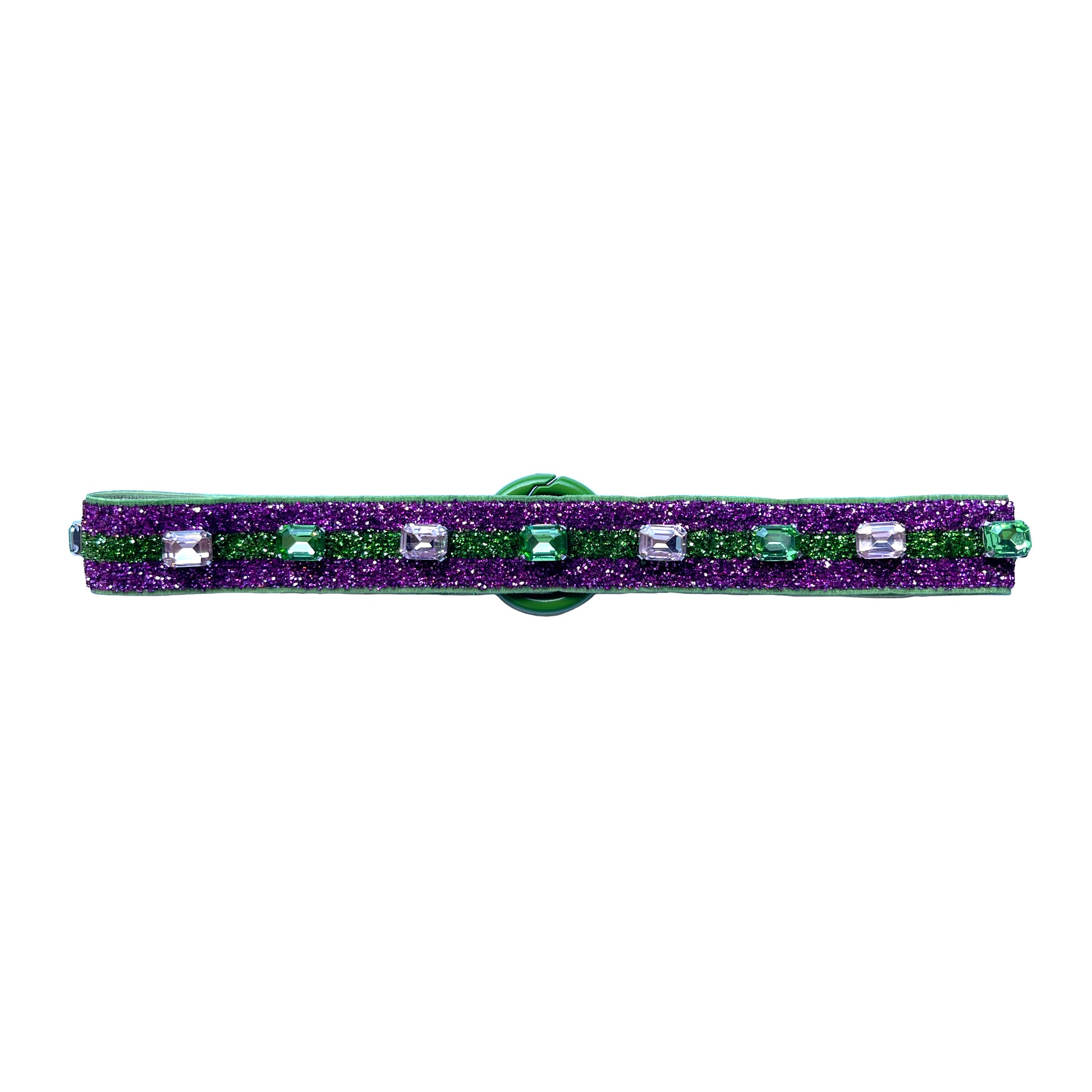POWERPUFF features a green stretch base with a green and pink metallic surface and enamel O-ring closure, accented by pink and green rhinestones on a silver setting.